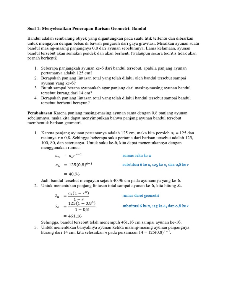 Postingan ini membahas contoh soal barisan & deret geometri dan pembahasannya atau penyelesaiannya. Tentukan jumlah kelima suku barisan tersebut. Tidak hanya itu, kita juga harus dapat membedakan antara barisan dan deret aritmatika ataupun barisan dan deret geometri, karena kaidah barisan dan deret dapat memudahkan kita dalam penyelesaian perhitungan. Deret aritmatika adalah pola bilangan berderet di dalam matematika, yang mempunyai manfaat sangat penting dalam berbagai hal. Berikut adalah contoh soal skd cpns deret dan aritmatika. Jawab 16 + 8 + 4 + 2. Deret geometri tak hingga divergen adalah deret geometri yang nilai bilangannya semakin membesar hingga tidak dapat dihitung lagi. Deret geometri tak hingga terbagi menjadi dua jenis yaitu tak hingga divergen dan tak hingga konvergen. Contoh soal deret aritmatika 6 : Karena soal ini sering muncul pada berbagai tes atau ujian nasional usbn ataupun. Contoh soal barisan & deret jawaban dan pembahasannya kelas 11. Lalu apa perbedaan antara barisan dan deret geometri ?. Sebuah tali dipotong menjadi 6 bagian sehingga membentuk deret geometri.