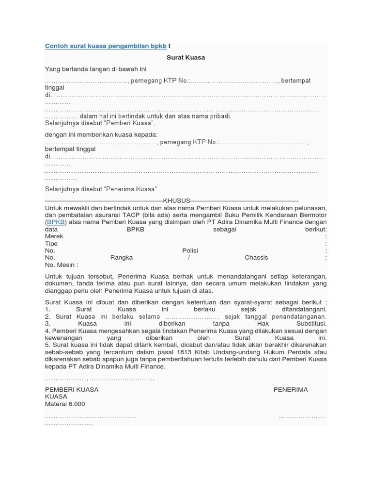 Surat kuasa pengambilan bpkb bermaterai. Contoh pembuatan surat kuasa pengambilan bpkb juga hampir sama dengan pembuatan surat kuasa lainnya. Baca surat kuasa pengambilan bpkb mobil. Syarat pengambilan bpkb di dealer. Pengambilan bpkb perlu dilakukan dengan mengunjungi kantor adira finance jl.